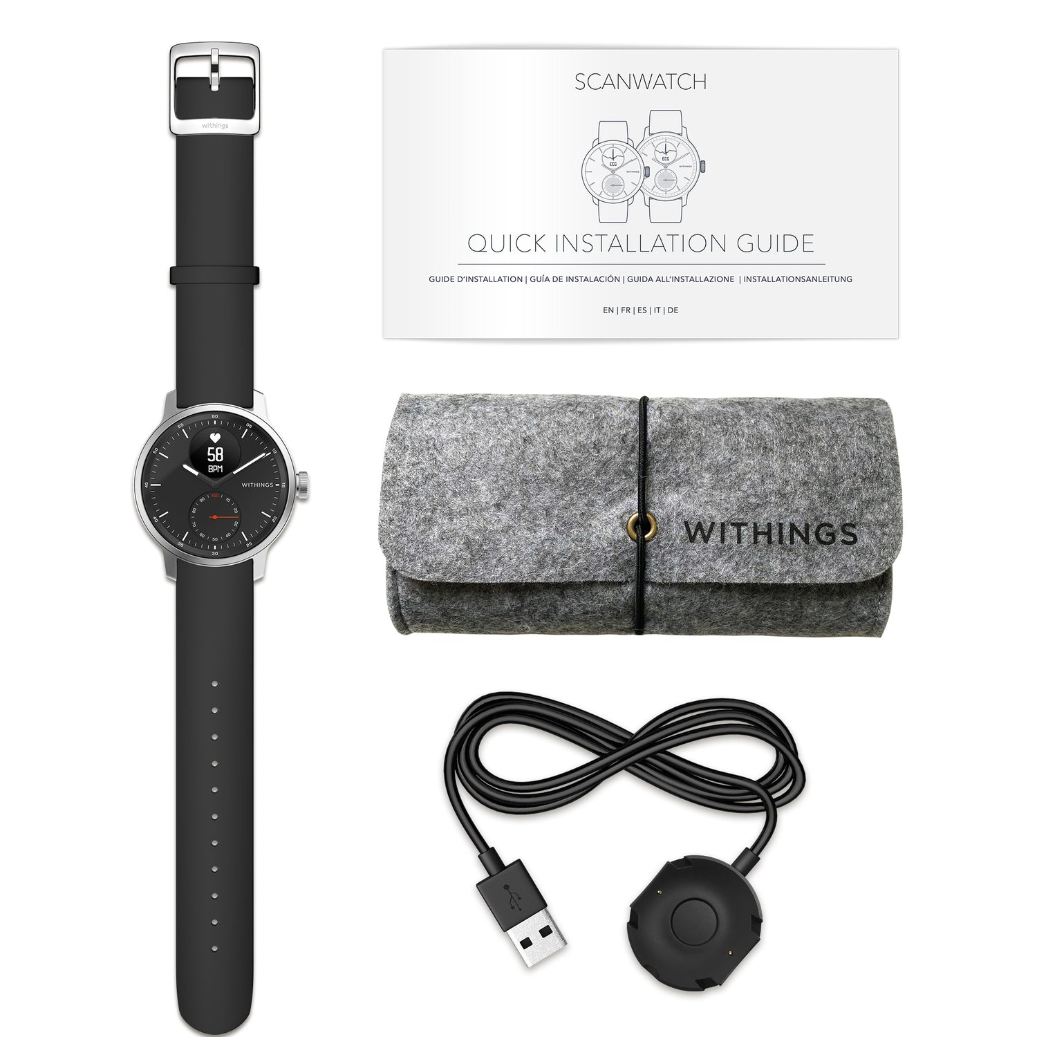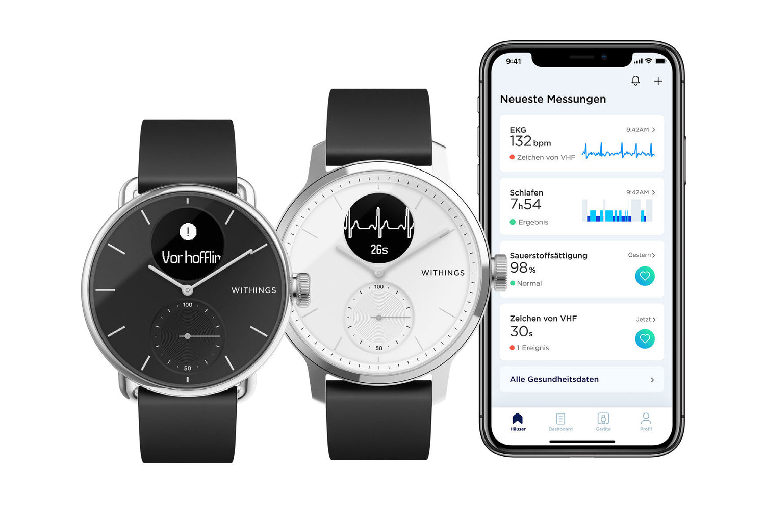 Elegantes Design & modernste Technik: Die ScanWatch verfügt über einen kombinierten Herzfrequenz- und SpO2 Sensor, zusätzlich 3 Elektroden für das EKG, einen Höhenmesser und einen PMOLED-Bildschirm.