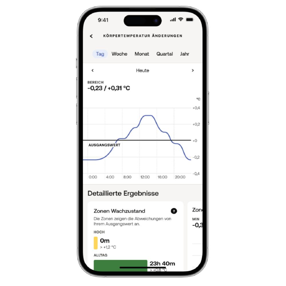 Ausgestattet mit dem revolutionären TempTech24/7-Modul, bietet sie kontinuierliche Überwachung der Körpertemperatur, ein klinisch validiertes EKG, Blutsauerstoff- und Herzfrequenzmessung und gewährt damit einen tiefen Einblick in Ihr Wohlbefinden.