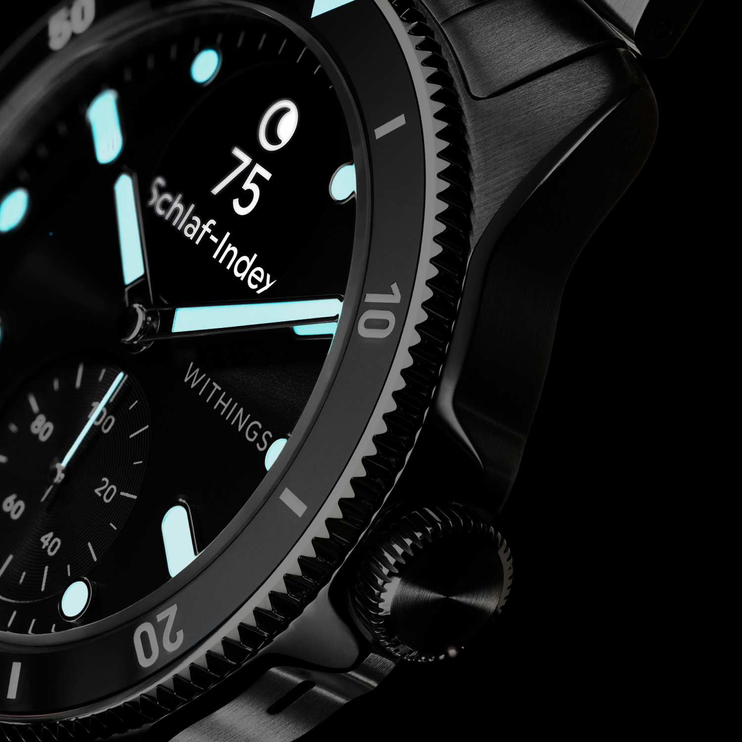 Die ScanWatch Nova ist mit dem bisher besten & hellsten Display von Withings ausgestattet. Das Graustufen OLED-Display verfügt über einen Durchmesser von 13 mm und bietet eine Auflösung von über 14.000 Pixel. Außerdem fahren die Zeiger nun automatisch aus dem Sichtfeld, wenn Sie die Uhr mit der digitalen Krone navigieren.